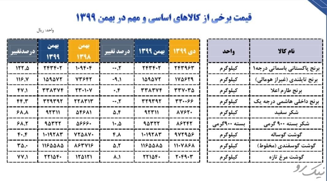 جزئیات بیشتر تغییر قیمت برخی از کالاهای اساسی در بهمن ماه امسال به شرح زیر است: