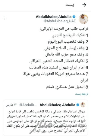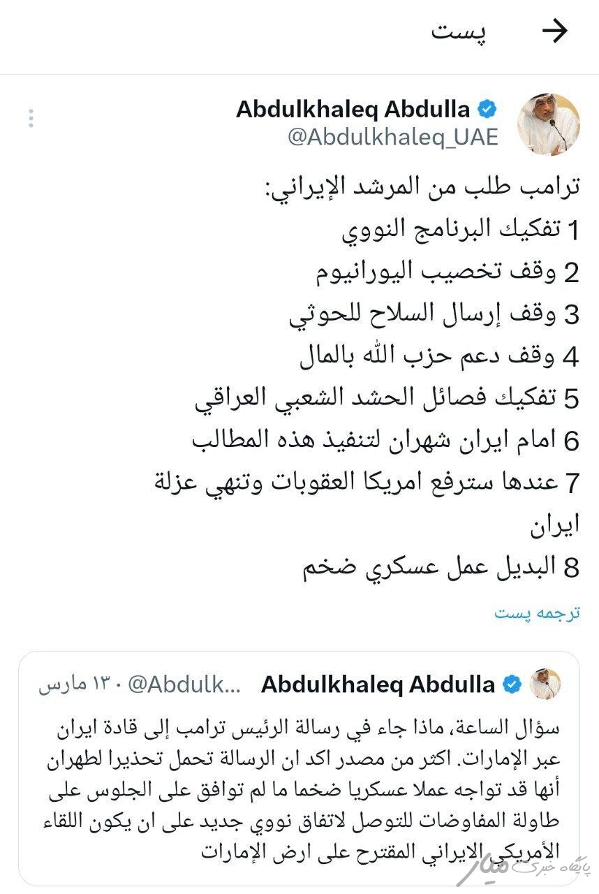 دکتر عبدالخالق عبدالله، استاد علوم سیاسی و نزدیک به دولت امارات، با انتشار توییتی جزئیات نامه ترامپ به رهبری ایران را فاش کرد. در این نامه، ترامپ ۸ خواسته کلیدی از ایران از جمله توقف غنیسازی اورانیوم و حمایت از گروههای منطقهای را مطرح کرده و هشدار داده است در صورت عدم اجرای این خواستهها، اقدام نظامی گسترده جایگزین مذاکرات خواهد شد.