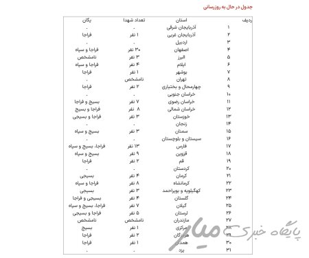 جدولی که خبرگزاری تسنیم درباره تعداد این حافظان امنیت منتشر کرده بود هنوز هم بعد از چهار روز توسط این خبرگزاری ردیف تهرانش پر نشده است که نشان میدهد تهران بیشترین شهید را داشته است و به همین دلیل شمارش و شناسایی شهدا برای نهادهای مربوطه سخت بوده است.